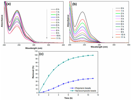 (a) Adsorption spectra of paracetamol on polymeric beads at different adsorption times, (b) adsorption spectra of paracetamol on nanocomposite beads at different adsorption times, and (c) paracetamol removal efficiency over varying adsorption times (adsorbent dosage = 0.3 g, concentration = 100 mg/L, pH = 7, adsorption time = 11 h, solution volume = 25 mL).