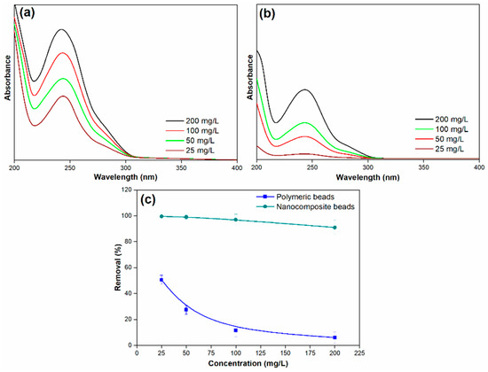 (a) Adsorption spectra of paracetamol on polymeric beads at various concentrations, (b) adsorption spectra of paracetamol on nanocomposite beads at various concentrations, and (c) paracetamol removal efficiency across different concentrations (adsorbent dosage = 0.3 g, concentration = 25 mg/L to 100 mg/L, pH = 7, solution volume = 25 mL).