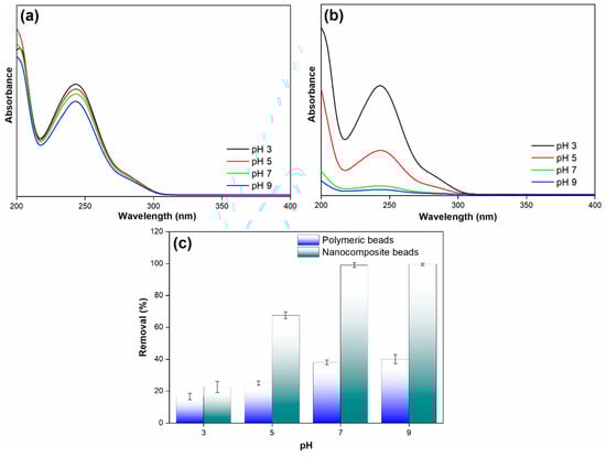 (a) Adsorption spectra of paracetamol on polymeric beads at different pH levels, (b) adsorption spectra of paracetamol on nanocomposite beads at varying pH levels, and (c) paracetamol removal efficiency across diverse pH conditions (adsorbent dosage = 0.3 g, concentration = 100 mg/L, pH = 3 to 9, solution volume = 25 mL).
