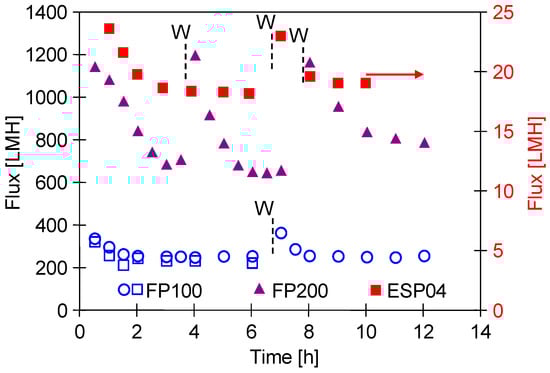 It is well known that the permeate flux obtained for UF membranes depends on the permeability (porosity) of the external separation layer. The initial performance of pristine membranes obtained for DI water is shown in Figure 4. In each case, an increase in the performance was observed after washing the membranes with the use of Insect solution (PH = 11.5). This cleaning agent contains NaOH (3–5%). Consequently, it leads to changes in the polymeric structure of the membranes and increases their permeability [,]. As expected, the highest flux of approximately 1200 LMH was obtained for the FP200 membrane (200 kDa), while it was only 25 LMH for the ESP04 membrane (4 kDa). During the UF process, due to the compression and stabilisation of the polymeric membrane matrix, the flux obtained is usually much lower. For the membranes tested, it stabilised at 850 LMH (FP200), 240 LMH (FP100), and 18 LMH (ESP04). Similar significant changes in the permeate flux during the initial period of the UF membrane testing are presented in []. FP100 membranes from production periods differing by one year were tested; however, this did not affect their separation properties (Figure 4, symbol circle and open rectangular).
