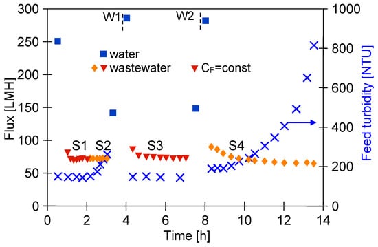 The results obtained during the UF process of WW1 wastewater using FP100 membranes are shown in Figure 8. During the filtration process with permeate return to the feed (CF = const), the flux decreased to 70 LMH (series S1). After 2 h of the UF process, concentration of the feed was initiated, resulting in an increase in turbidity from 150 to 257 NTU (series S2). The turbidity of the permeate was 0.18–0.21 NTU, similar to the separation of synthetic wastewaters (Figure 5b). Despite the increase in concentration of the suspended solids, the permeate flux did not decrease and was still 70 LHM. After rinsing the installation with DI water, the pure permeate flux was 148.9 LHM and increased to 295.8 LHM after 30 min of washing with 0.5% Insect solution (Figure 8, point W1). Similarly, after separation of the next portion of the WW1 (series S3—CF = const, 148 NTU), the pure water flux was 147.5 LHM and increased to 292.6 LHM after 30 min of washing with the Insect solution (W2). This result indicates that the twofold increase in concentration of suspended solids during the S2 series had little effect on the intensity of fouling. In the next series (S4), the filtrate was concentrated 4 times, resulting in an increase in turbidity to 810 NTU. The impact of the increasing concentration of suspended solids was greatest during the initial filtration period, during which, the filtration cake is formed. Further, the permeate flux stabilised at 65 LMH, but the increase in the fouling layer with increasing concentration is evidenced by improving separation since the permeate turbidity decreased from 0.35 to 0.23 NTU.