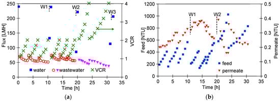Course of WW2 wastewater separation by FP100 membranes: (a) flux and (b) feed and permeate turbidity. W1, W2, W3—membrane washed using 0.5% Insect solution (30 min). The last two series—retentates from previous runs (VCR = 2) used as a feed.