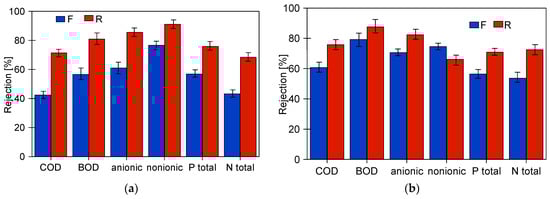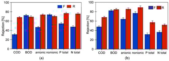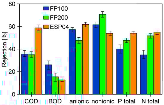 The suspended solids have a significant impact on the results of the parameters tested. Table 2 shows how their values change for the tested wastewater after filtering through the filter paper, which removed most of the suspended solids. As a result, most of the parameters tested decreased, which is due to the fact that components of the wastewater can precipitate or adsorb on the surface of the suspension [,]. A comparison of the retention rates calculated in relation to the filtered feed is shown in Figure 15. Although the retention rates have decreased, they are still above 50% for the majority, indicating that dissolved wastewater ingredients were also partially retained by the membranes tested.