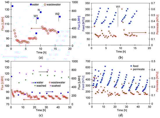 The smaller decrease in flux indicates that the deposits remaining after washing the membranes (W1) may have contributed to the more porous structure of the reconstituted filter cake. After a further washing of the membranes with Insect solution (W2), the pure water flux was 690 LMH (Figure 12a). In the next step, the retentates obtained in the previous WW2 wastewater filtration (VCR = 2) were separated again reducing their volume by half (total VCR = 4). As a result of a significant increase in the turbidity of the feed (310 NTU), the obtained permeate flux decreased from 100 to 80 LMH (Figure 12c). Systematically repeated washing allowed the flux to be maintained at this level. As before, the UF process was carried out periodically, and the pure water flux determined after a given filtration was at 250 LMH; its value after washing with Insect solution increased to 620 LMH (washed) and after an overnight soak in DI water to 730 LMH (Figure 12c, soaked). Membrane washing caused the turbidity of the permeate to increase to 0.25 NTU, which decreased to 0.1 NTU during UF (Figure 12d). This result confirms that fouling significantly improves separation.