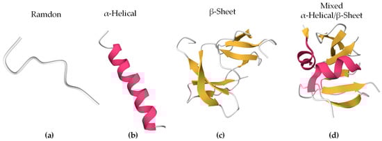 Bioactive peptides can adopt different secondary structures (Figure 1). Some peptides are unstructured upon interaction (random/coil), while others adopt a more stable structure before or after they associate with lipids. The largest population of reported secondary structures of BAPs is α-helix, followed by random coil and β-sheet []. These elements often coexist in the same peptide.
