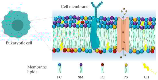 In addition to populating many unicellular communities, eukaryotic cells are the building blocks of complex multicellular living systems. Eukaryotic cells require a demarcating structure that separates them from their external environment and envelopes their internal membrane-bound organelles. This structure is called plasma membrane, and is consistent in its construction across the Eukarya []. The classic model of bio-membranes was proposed by Singer and Nicolson, who named it the fluid mosaic model []. In this model, the membrane was described as an unstructured liquid–crystal characterized by a disorderly and chaotic arrangement of molecules in a two-dimensional liquid–crystal matrix. However, with advances in membrane biophysics, the model was complemented and improved, extending the description and the understanding of the membrane organization by including the notion of a heterogenous arrangement of lipids and proteins on the membrane surface due to the formation of lipid domains. The cell membrane is currently described as a heterogeneous two-dimensional semi-fluid barrier that acts as a matrix containing a population of lipids, proteins, and glycolipids with transitory mobility (Figure 2) [].