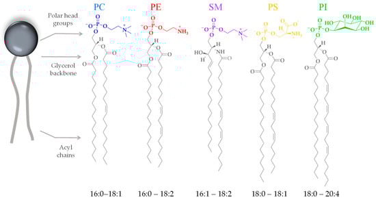 The plasma membranes and organelle membranes of the different cell types found in the human body exhibit widely diverse lipid compositions. Lipid bilayers have many functions, and can have specific features depending on the functional characteristics that the different membranes have to fulfill []. Corresponding to these functions, different lipid types are present in the different cavities and leaflets of each membrane. Lipids, such as sphingomyelin and cholesterol, found in the outer leaflet of the plasma membrane of T-cells, help organize transmembrane proteins in charge of detecting and eradicating pathogens [], while cardiolipin is found in the inner membrane of mitochondria, providing the spontaneous curvature needed to induce the characteristic folding of this membrane [].