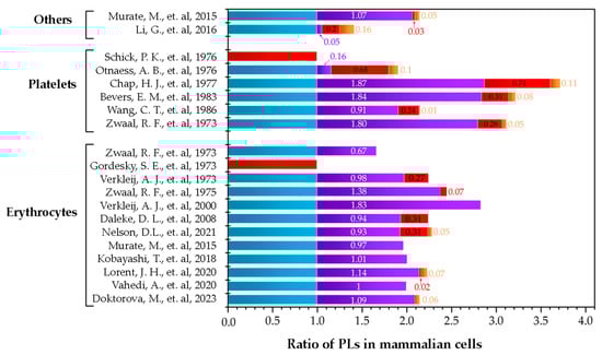 Summary of publications that quantified the phospholipid distribution in mammalian cells. Others are fibroblasts and cancer cells. The colors correspond to PC (