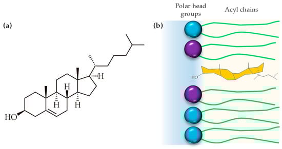 Among sterols, cholesterol is the main sterol found in eukaryotic membranes, where it makes up 10–50% of total lipids in eukaryotic cells and has a range of effects on overall membrane properties []. It has long been noticed that the biophysical and biochemical properties of the membrane are diversely affected by the lipid composition and organization []. However, the unique structure of CHO with a polar head and rigid ring structure in its hydrophobic tail renders the molecule particularly important in regulating biophysical properties that affect lipid packing, fluidity, lateral organization, and the shape of phospholipid bilayers []. As a regulator of membrane physical properties, it is a crucial component of many cellular functions, including vesicular transport and the signal transduction pathways []. CHO plays important roles in the organism as the precursor of several hormones, bile acids, and vitamin D, holds the membrane proteins in a functional conformation, and is also an important mediator in cell signaling pathways []. Some studies also show that cholesterol takes part in the communication between intra- and extra-cellular processes as a modulator of various processes [].