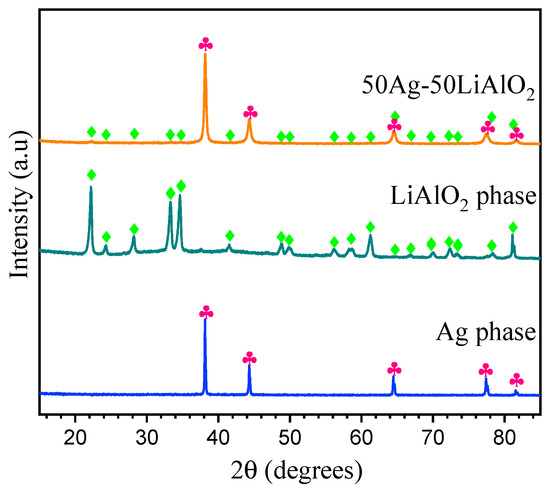 XRD analysis of the pristine materials (γ-LiAlO2, Ag) and γ-LiAlO2/Ag cermet (50:50 vol. %) synthetized by the ball milling process.