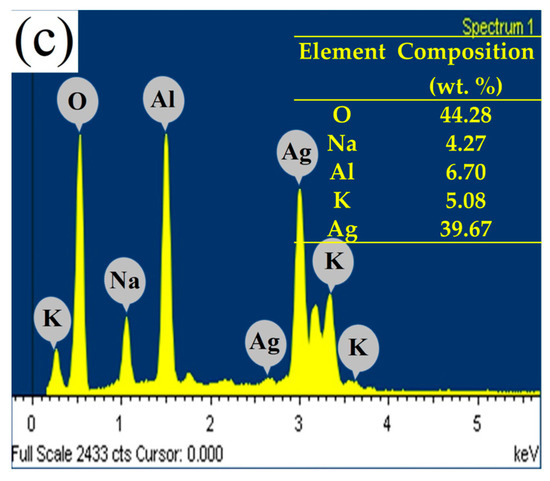 The morphology, particle size, and microstructural features of the γ-LiAlO2/Ag cermet differ significantly from the pristine materials (Figure 2a–c). On the one hand, the silver powders were mainly composed of spheroidal particles exhibiting particle sizes in a range of 4–35 μm; on the other hand, γ-LiAlO2 was composed of soft, irregular agglomerates on the submicrometric scale. In the case of cermet, the powders showed irregular morphologies and particle sizes of about 5–30 μm. Finally, the SEM image obtained by the backscattering technique (Figure 2d) shows that milling processing promotes the integration of both single materials, ceramic, and metal to form the expected composite. This technique agrees with the results of the XRD, since it successfully indicated the formation of the cermet. Similar behavior was observed during the formation of the Ce0.9Sm0.1O2−δ/Ag and LiAlO2/Ag cermets, which have previously been studied [24,25]; therefore, these results evidence the feasibility and reproducibility of the ball milling procedure for cermets’ formation.