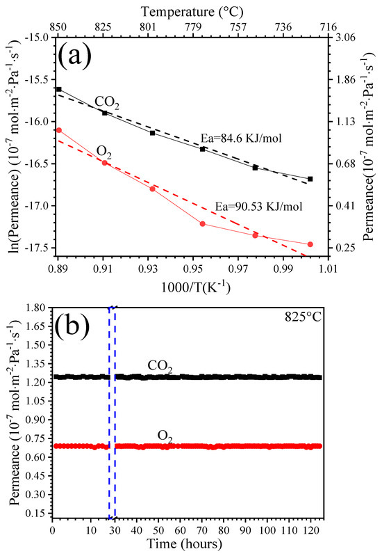 As expected, the apparent activation energy values were calculated by constructing Arrhenius plots (Figure 4a). The CO2 and O2 permeances had similar Ea values of 84.6 kJ·mol−1 for CO2 and 90.5 kJ·mol−1 for O2. This fact results from the transport of both species being a concurrent phenomenon related to Reaction (4) (backward). The long-term stability of the membrane under permeation conditions was examined at 825 °C.