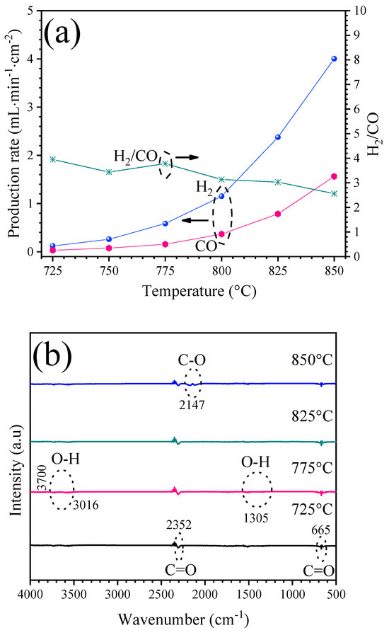 Syngas production when using a sweep of 5 vol. % of C3H8 in argon: (a) H2 and CO production rates as a function of temperature; (b) FT-IR in situ analysis of the syngas at different temperatures. Arrows indicate the corresponding Y axis.