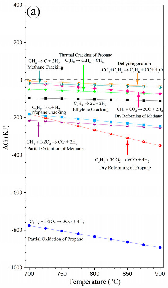 The main drawback of a dry reforming reaction is that it is highly endothermic and, therefore, energy-consuming. The utilization of air/oxygen mixtures has been investigated through the so-called oxidative reforming reaction by combining a partial oxidation process, as represented by Reaction (2), to decrease the energy costs and produce syngas during C3H8 reforming with CO2 (Reaction (3)) [8,10,11].