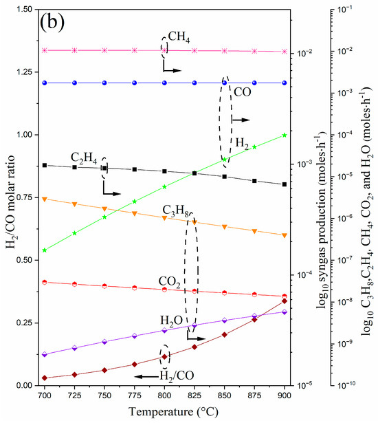 Thermochemical simulations of syngas using FactSage 7.2 software: (a) ΔG° versus temperature of the main reactions involved in the syngas production; (b) thermodynamic equilibrium calculus of the produced species at high temperatures (600–900 °C). Arrows indicate the corresponding Y axis.