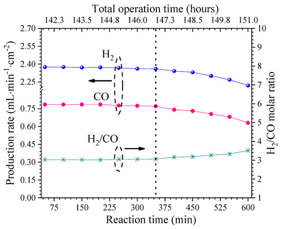 Stability of syngas production through the cermet–molten-carbonate membrane under oxidative reforming of propane. Stability of membrane with a total continuous operation time of 151 h. Arrows indicate the corresponding Y axis.