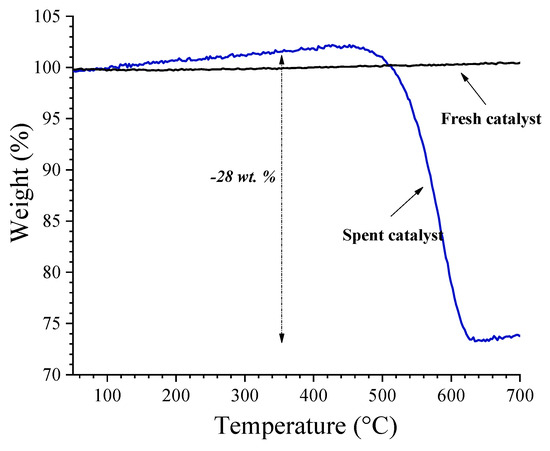 TGA analysis of the fresh and spent catalysts. The weight change indicates the removal by combustion of the carbon formed due to the thermal cracking reactions.
