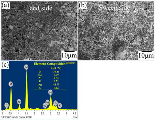 SEM postmortem of the cermet–molten-carbonate membrane: (a) feed-side surface in contact with the feed mixture of CO2/O2/N2 (15/17/68 vol. %); (b) surface in contact with a 5 vol. % of C3H8 in argon, at a total flow of 50 mL·min−1; (c) elemental analysis by EDS of the sweep side of the membrane.