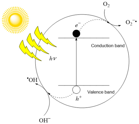 Photocatalysis uses homogeneous or heterogeneous light-activated catalysts to generate highly reactive species, primarily the hydroxyl radical, for the degradation of pollutants. There are two forms of photocatalysis: heterogeneous and homogeneous. Heterogeneous photocatalysis is the type of photocatalysis mostly used in AOPs. A photocatalyst is a material in which the creation and separation of photogenerated charges (electron (e−) and hole (h+) pair) occurs upon excitation of radiation of a certain wavelength. For the photocatalyst to function, it needs to absorb energy equal to or exceeding the band gap energy (Eg). The band gap energy is a type of energy threshold in a semiconductor that distinguishes the valence band energy levels from the conduction band energy levels. When an n-type semiconductor is excited by radiation of a suitable wavelength, an electron passes the threshold between bands, leaving the positive hole behind (Figure 1). This procedure occurs within the bulk of the photocatalyst material during heterogeneous photocatalysis. These photogenerated charge carriers then move to the photocatalyst’s surface where they engage in both direct and indirect reactions (the formation of radicals) [76]. For this phenomenon to be effectively utilized, the separated charges must navigate to the surface of the photocatalyst. In this journey, they need to evade recombination both inside the photocatalyst and at its surface [77]. Upon reaching the surface, electrons or holes may engage in direct reactions with adsorbed contaminants on the photocatalyst’s surface [78]. Additionally, they can take part in indirect reactions with water, leading to the formation of reactive oxygen species. The electrons interact with dissolved oxygen in the solution, generating superoxide radicals, while the holes react with hydroxyl anions to create hydroxyl radicals. These resulting radicals subsequently decompose the pollutants throughout the entire volume of the solution [77,79].