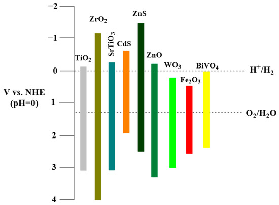 Metal oxides have broadband gaps due to their strongly positive valence bands, which are characterized by oxygen 2p orbitals. Specifically, their band gap widths are 2.7, 3.0–3.2 and 3.2–3.3 eV for WO3, TiO2 and ZnO, respectively (Figure 2). Such values practically eliminate their use in solar-driven photocatalysis [84].
