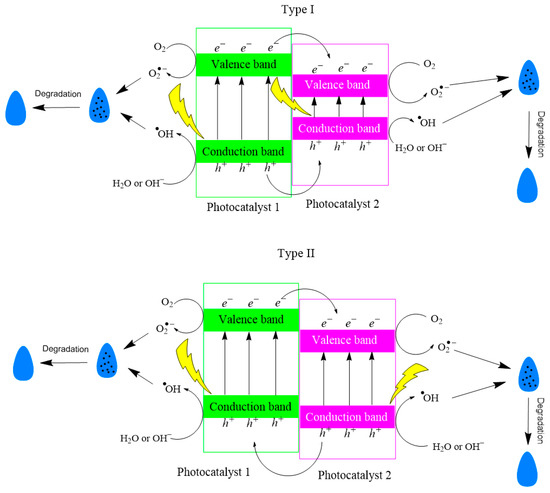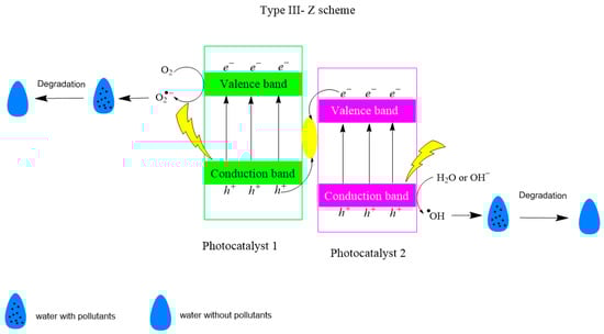 Composites are compounds made from two or more different materials. If the composites are functional, they can be used for charge transfer between photocatalysts and thus reduce the influence of recombination during photocatalysis. Apart from the classic p–n type junction (used in photoelectrochemistry), composites can be divided into three types depending on the position of their band gaps, one against the other. In a type I compound, the first photocatalyst has a wider band gap (Eg1) compared to the second photocatalyst (Eg2), positioning Eg2 within Eg1. Electrons transition from the photocatalyst’s valence band with the higher energy level to the photocatalyst’s valence band with the lower energy level, while holes move in the same way between the conduction bands of both photocatalysts. Generally, this compound does not improve the photocatalytic characteristics of the composite. In a type II compound, the valence band and conduction band of the first photocatalyst are positioned at higher energy levels than their counterparts in the second photocatalyst. This leads to electron migration from the first to the second photocatalyst and hole migration in the opposite direction. Effective contact between the photocatalysts promotes this process during radiation, reducing charge carrier recombination. In a type III compound, both bands of the first photocatalyst are energetically higher than the other photocatalyst. Recombination occurs between the holes of the first photocatalyst and the electrons of the second. If a type III compound includes an electron mediator (e.g., elemental silver) between the photocatalysts, it is known as the Z-scheme and is utilized in photocatalysis applications (Figure 3). The formation of specific radicals is dependent on the opto-electronic properties of the composite material [77,85,94].
