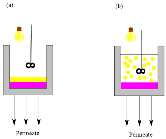 (a) Immobilized photocatalytic membrane reactor and (b) suspended photocatalytic membrane reactor.