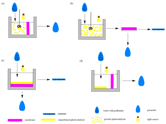 Variants of (a,b) suspended photocatalytic membrane reactor and (c,d) immobilized photocatalytic membrane reactor.