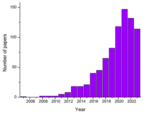 The increase in the number of published papers with the keywords “photocatalytic nanocomposite membranes” used to perform a search of the scientific database Web of Science is shown in Figure 6. In the last few years, there has been a slight decline in published papers, but since 2020, they have passed the 100-paper mark annually.