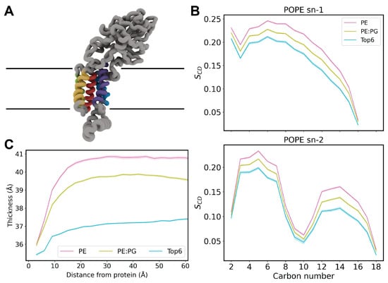 Despite the differential membrane composition in our Top6 replicas, we recapitulated local membrane thinning of YidC also previously reported [19,20] as well as trends in deuterium order parameters [37,38] for POPE lipids. Membrane thickness (Figure 1B) was measured as the average z-distance between phosphorous atoms of each leaflet radially in discrete 3-Å rings from the TM domains. Long-distance measurements illustrate the bulk membrane thickness, while measurements made within 10 Å capture local membrane clamping that has been previously observed in YidC simulation in mixed PE/PG bilayers [19,20]. Despite being thinner membranes, the Top6 systems also recapitulate this clamping behavior, albeit less dramatic than previously reported.
