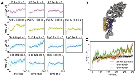 The robust equilibration of all simulated replicas, as indicated by the converged RMSD plots, supports the reliability of our results. Moreover, the agreement of bulk properties such as membrane thickness and deuterium order parameters with previously established membrane-only simulations by the Klauda group further validates our simulations [37,38]. The variability in the local lipid environment and lipid exchange between the annular layer and bulk membrane suggest reasonable sampling in our systems, ensuring that our analysis is likely to capture physiologically relevant protein–lipid interactions.