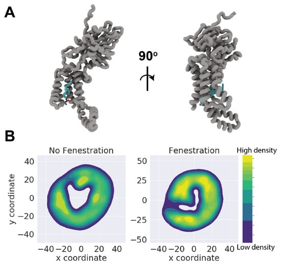 In order to provide a better estimation of lipid penetration, the distribution of lipid phosphorous atoms was used to generate a kernel density estimate. By binning coordinates of phosphorous atoms belonging to the cytoplasmic leaflet within 20 Å of the TM domain, we generated plots for both a model fenestrating and non-fenestrating simulation (replicas 5 and 3, respectively), shown in Figure 4. We chose to exclude lipids belonging to the periplasmic leaflet as we observed no penetration from these lipids, likely owing to TM cracking occurring only in the cytoplasmic end of the transmembrane region. To ensure that these plots are comparable, the protein was centered and aligned with the C1 loop pointing along the y axis throughout the trajectory. Patterns of residence in both systems appear to be somewhat consistent, but it is of note that the central cavity is unoccupied in the model non-fenestrating system. A key feature found in all replicas is a small indentation in the KDE plot, which indicates minor or transient lipid entry (Figure S4).