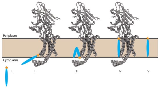 - He, H.; Kuhn, A.; Dalbey, R.E. Tracking the Stepwise Movement of a Membrane-inserting Protein In Vivo. J. Mol. Biol. 2020, 432, 484–496. [Google Scholar] [CrossRef]