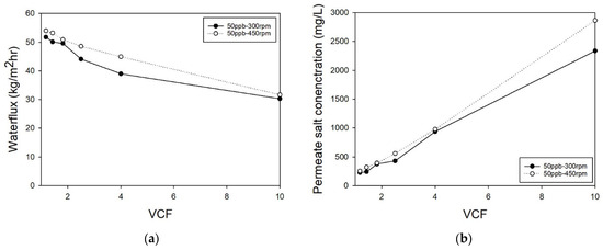 The result of NF experiment. (a) Permeate water flux and (b) NaCl concentration of permeate by VCF.
