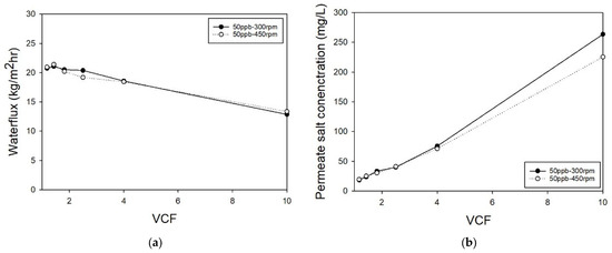 The result of RO experiment. (a) Permeante waterflux and (b) NaCl concentration of permeate by VCF.