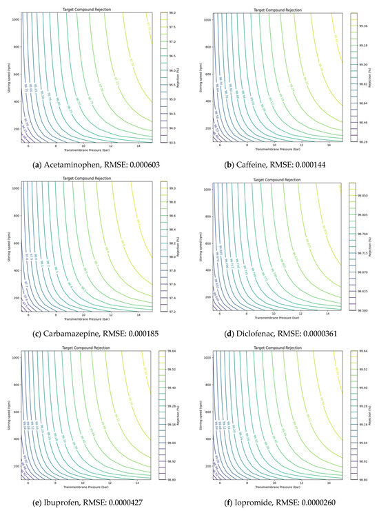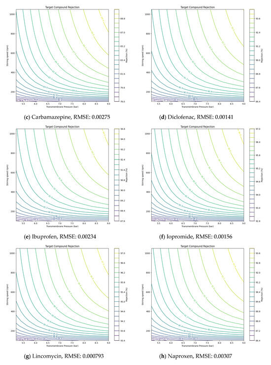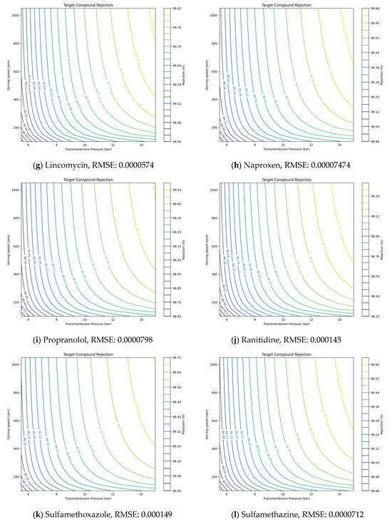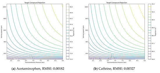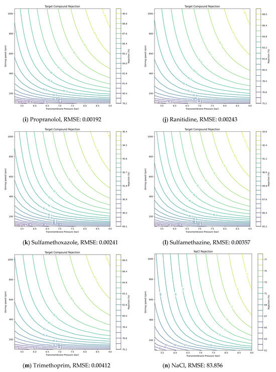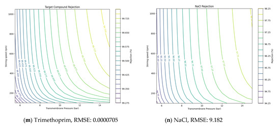 Using the values derived from NF and RO experiments, the solution diffusion model was applied to predict the removal rates of target compounds under various operating conditions, such as pressure and stirring speed. The Ls values for each compound, derived from the experimental results, are presented in Table 5. values, representing solute transport parameters, helped estimate how these parameters affected removal efficiency. Additionally, the root-mean-square error (RMSE) was utilized to validate the accuracy of the model’s predictions against experimental data [30,31]. By incorporating RMSE, the model provided more precise insights, showing how adjustments in pressure or stirring speed could optimize NF and RO membrane performance under different conditions.