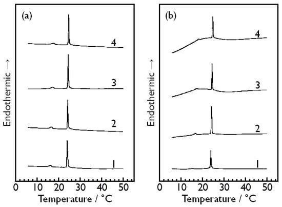 As an example, Figure 2a,b show the DSC thermograms obtained for the DMPC vesicle dispersion in the 2.64 mol kg−1 aqueous D-glucose solution in the case of using Milli-Q water as a reference solution or using the same 2.64 mol kg−1 aqueous D-glucose solution as was used for preparing the sample dispersion as a reference solution, respectively. Both thermograms exhibit a sharp endothermic peak at ca. 24 °C arising from the main transition of the DMPC bilayer membrane [1,2], which indicates that the DSC measurements performed in this study can detect this bilayer phase transition clearly, irrespective of the choice of which to use as a reference solution. However, it is evident that the stability of the baseline is completely different between both DSC thermograms. In the case of using Milli-Q water as a reference solution (Figure 2a), the stability of the baseline of the obtained thermogram is obviously poor (or low), and the whole range of the variation of the baseline throughout the measurement is apparently larger than the range of the variation at the endothermic peak (i.e., peak height) attributed to the main transition at 24 °C. This large variation in the baseline makes a small endothermic peak arising from the pretransition of the DMPC bilayer membrane at ca. 15 °C [1,2] almost indiscernible. Even if the presence of this small endothermic peak is discernible, it is quite difficult to determine the onset and the completion temperature of the peak accurately because of the large curvature of the baseline. This means that the DSC measurements performed on this condition is virtually unable to capture the pretransition of the DMPC bilayer membrane accurately. By contrast, the stability of the baseline is apparently far better in the DSC thermogram obtained when the aqueous D-glucose solution was used as a reference solution, and the variation in the baseline throughout the measurement is sufficiently small, as seen from Figure 2b. Note that this DSC thermogram is also a raw thermogram, as with that shown in Figure 2a, which means that both are compared under the same condition except for the difference in the reference solution used. This high stability of the baseline makes it easier to clearly identify the small endothermic peak arising from the pretransition, which enables us to determine the enthalpy change with the pretransition more correctly as well as the enthalpy change with the main transition. On the basis of this result, we used the same aqueous sugar solution as was used for preparing a sample solution as a reference solution in the subsequent DSC measurements to observe the phase transitions of the DMPC bilayer membrane in various kinds of aqueous sugar solutions. This fact, that the same aqueous sugar solution works much better as a reference solution, may suggest that in the sample dispersion (i.e., DMPC vesicles in the sugar solution), most of the monosaccharide molecules exist in the bulk water phase.