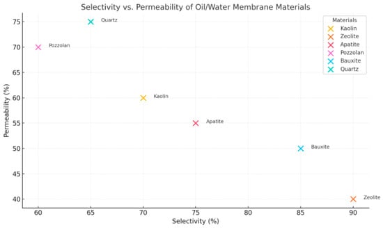 | Apatite | Mineral (Phosphate-based) | Good chemical stability, adsorbs heavy metals and other pollutants. | Biocompatibility, versatile adsorption | Limited structural durability | 1100–1300 | Filtration in oil-contaminated industrial wastewater. | [50,135,136] |
