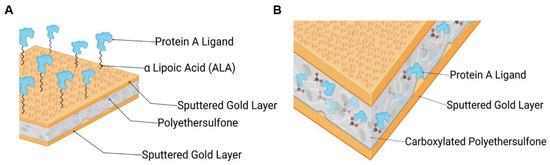 Schematic of immobilized Protein A ligand via two different functionalization approaches, created via Biorender: (A) via a self-assembled monolayer of ALA on the gold surface (ALA@Au_PES200) and (B) via carboxy groups grafted into PES by e beam technology (Au_PES200@COOH).