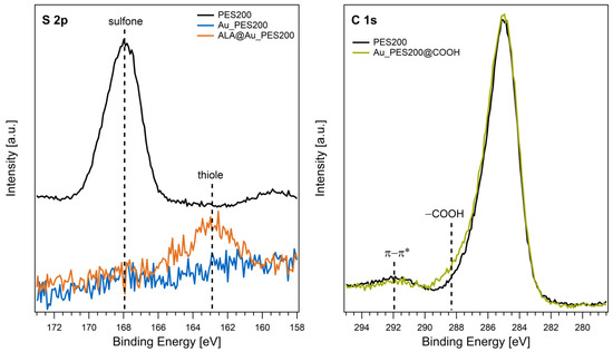 The left panel of Figure 3 displays the S 2p core level spectra of native PES200, Au_PES200, and ALA@Au_PES200. The signal of the native membrane is centered around 168 eV, which is in good agreement with the binding energies of sulfone groups in PES materials reported in the literature [25]. After the gold-sputtering process, no sulfur species are detected on the surface (Au_PES200). Hence, the S 2p signal of the PES polymer is completely attenuated upon the deposition of an entirely closed Au layer on the membrane surface as observed by surface-sensitive XPS. The functionalization of the material with ALA results in an S 2p signal with a binding energy of 163 eV. This value is characteristic for thiol groups, proving a successful functionalization of the Au surface with sulfur-containing ALA [30].