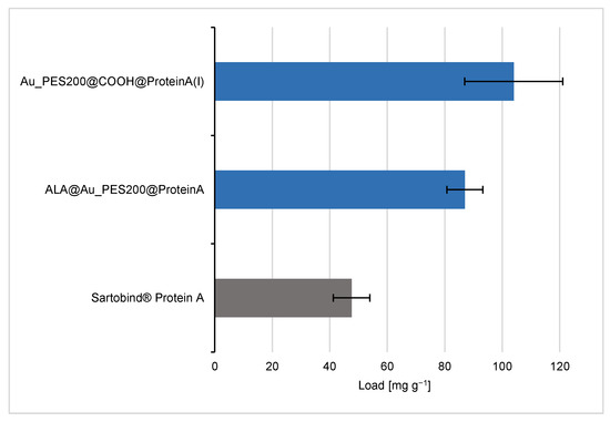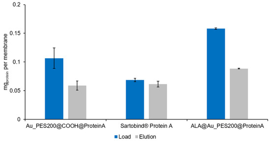 The analysis of the binding behavior of the differently functionalized affinity membranes shows different trends. For the sake of comparability, the membranes’ dry weight (see Table S1) is used as reference point to calculate the maximal protein load (see Figure 4). Therefore, the maximum load values are in units of mg of IgG per g of membrane. The Au_PES200@COOH@ProteinA with immobilization protocol (I), where the carboxylated material was used for the immobilization reaction with a longer NHS/EDC protocol, is one of the best candidates with a maximal load qmax of 104 mg g−1, alongside the ALA-surface-functionalized membranes.