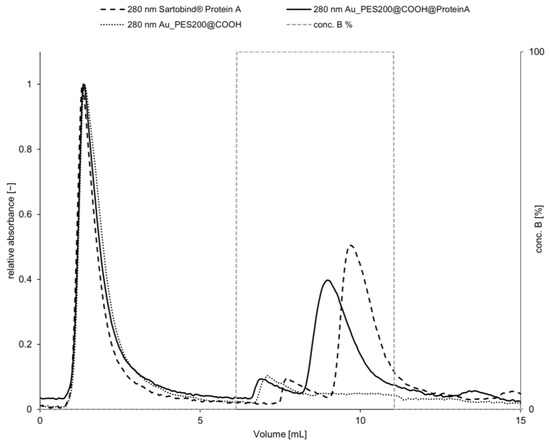 After proving the binding and eluting behavior, experiments were transferred in a dynamic setup under process conditions. For this experiment, a Trastuzumab concentration of 0.264 mg mL−1 was used. After NaCl tracer analysis, the membrane module volume (MV) was calculated to be 0.3 mL. Looking at the chromatogram, a clear capture and release is evident and proves the applicability of the designed membrane in a dynamic process (see Figure 6). The control membrane Au_PES200@COOH, without any ligand protein, shows no elution peak at 280 nm after antibody contact; therefore, the Trastuzumab was not captured. In traditional column chromatography, the dynamic binding capacity DBC10 indicates the amount of protein that can be purified from a particular resin volume and serves as a process parameter allowing for comparison of different materials and processes. Breakthrough analysis is the most popular method for measuring it [35]. Commercially available bed-based chromatography products with Protein A, such as MabSelect™ by Cytiva, have dynamic binding capacities of 35–65 mg mL−1 and retention times (RT) of 2.4–6 min; Monofinity A Resin™ by Genscript achieved a DBC10 of 30 mg mL−1 with a RT of 4 min or even monoliths such as CIMac™ by BIA Separations of >5 mg mL−1 [6]. In a recent study by Osuofa and Husson [36], different new affinity membrane materials were tested regarding performance. The four tested membranes comprised a composite membrane by Gore, an electrospun fiber by Cytiva, an affinity membrane from Purilogics which is based on a convection-based flow, and the Sartobind® Protein A membrane. Among all listed membranes, the only membrane material that is comparable with the technology used in this approach is the Sartobind® membrane. The other mentioned membranes have structurally changed properties, leading to higher binding capacities, and probably exhibit a certain degree of higher mass transfer limitations. Membranes and monolithic materials will always have a lower binding capacities than bead-based chromatography, as their specific surface area is significantly lower [4]. However, in the overall yield, this is amortized due to a lack of mass transfer limitations for membranes [3].