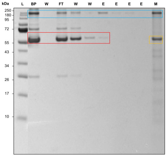 Image of 12% SDS-PAGE of an antibody’s purification process from human blood plasma. The red box shows serumalbumin, the blue box antibodies, and the yellow box the Protein A ligand on the membrane. (BP) 1:100 diluted blood plasma; (W) wash with 1× PBS pH 7.4; (FT) flowthrough during the loading step; (E) elution with 50 mM Na-acetate pH 2.9; (M) used membrane after the process, submerged and cooked at 95 °C for 5 min in loading buffer.