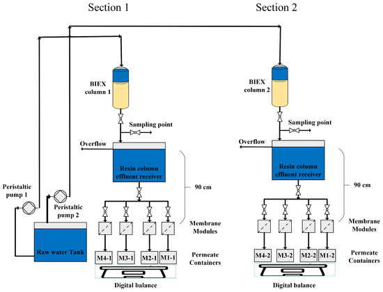 Experimental BIEX + GDM filtration pilot setup. BIEX resin operated at a 4 BV/h filtration rate and EBCT = 15 min. M1-1 and M1-2: flat-sheet disk-shaped 0.1 µm (MF) PES, M2-1, and M2-2: flat-sheet disk-shaped 0.03 µm (UF) PES, M3-1, and M3-2: flat-sheet disk-shaped 300 kDa (UF) ceramic, M4-1 and M4-2: lab-made flat-sheet disk-shaped ceramic MF membranes (Kaolin support + alumina layer).