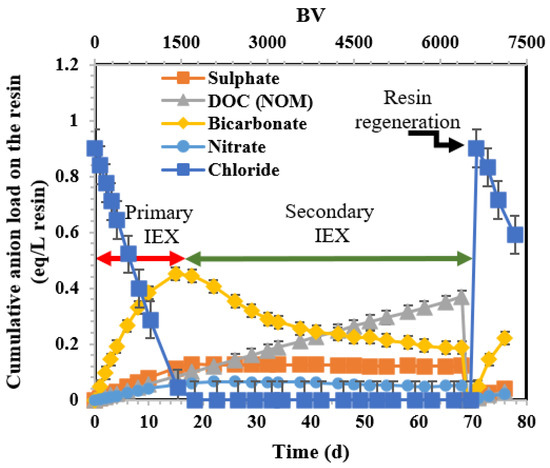 Variation in chloride, sulphate, DOC, and bicarbonate loads (as m eq/L of resin) on the BIEX 1 column during the operation. Regeneration was performed on day 68 (6528 BV). The error bars show 95% confidence intervals.