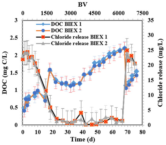 DOC concentration and chloride release in the effluent of the BIEX columns during the operation period. Day 68 (6528 BV) is the resin regeneration day. The error bars show 95% confidence intervals.