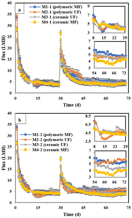 - Before membrane cleaning (days 1–29), the fluxes of the membranes stabilised after day 8 at approximately 4.5–5 LMH. After membrane cleaning (days 30–73), the flux was restabilised after 24 days (i.e., on day 54). The new stabilised flux of the membranes was approximately 3.7–5.5 LMH at the end of filtration, which was statistically significant. However, this difference was not substantial, indicating that the membrane material is not a key factor.