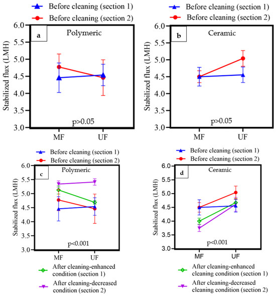 After cleaning the polymeric membranes (Figure 5c), stabilised fluxes increased significantly (p < 0.001) from 4.46 (MF)–4.54 (UF) LMH to 5.13 (MF)–4.69 (UF) LMH (after the enhanced cleaning condition in Section 1) and from 4.77 (MF)–4.46 (UF) LMH to 5.34 (MF)–5.41 (UF) LMH (using the less stringent cleaning condition in Section 2). Although statistically significant (p < 0.001), increasing the cleaning intensity did not substantially improve stable fluxes from a practical perspective. The membrane type (UF vs. MF) was equally impacted by the cleaning conditions for the ceramic membranes. After cleaning the ceramic membranes (Figure 5d), the stable MF flux declined for both cleaning conditions (Section 1 and Section 2), while the UF was not impacted by cleaning in Section 1, which was subjected to enhanced cleaning conditions. In contrast, the ceramic UF in Section 2, which was subjected to a lower cleaning condition, exhibited a stabilised flux decline of 8.5%. During the clean-in-place process, some foulants were solubilised and could penetrate the membrane pores, causing internal clogging when the membranes returned to normal operation. In summary, cleaning the membranes generally led to a fairly modest increase in the stable flux, except for ceramic MF membranes.