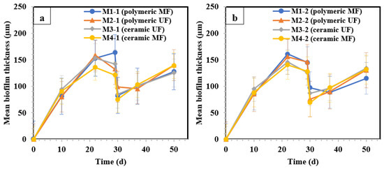 Evolution of mean biofilm thickness (µm) of (a) the membranes in Section 1 and (b) the membranes in Section 2. M1 (polymeric 0.1 µm MF), M2 (polymeric 0.03 µm UF), M3 (ceramic 300 kDa UF), and M4 (Lab-made ceramic MF). Day 30 is the physical and chemical cleaning day. The error bars show 95% confidence intervals.