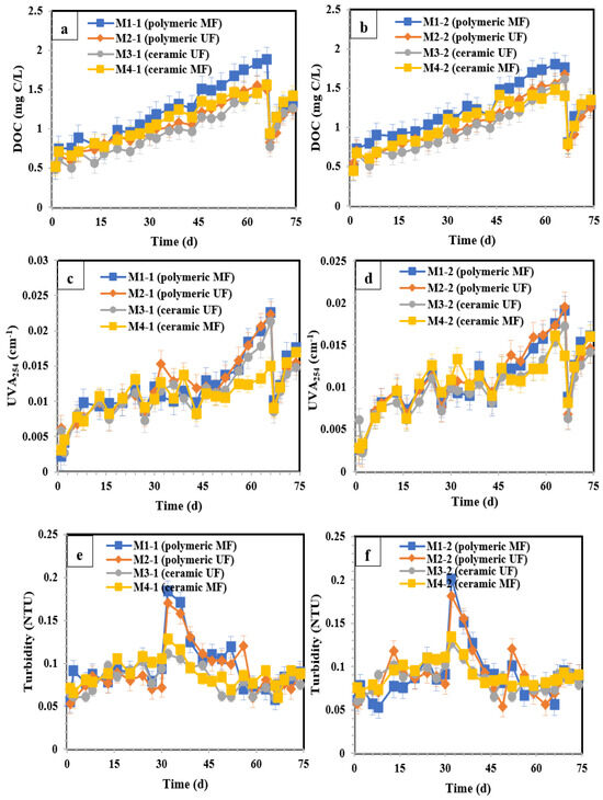 Variation in (a) DOC in Section 1, (b) DOC in Section 2, (c) UVA254 in Section 1, (d) UVA254 in Section 2, (e) turbidity in Section 1, and (f) turbidity in Section 2 during the filtration time. M1 (polymeric 0.1 µm MF), M2 (polymeric 0.03 µm UF), M3 (ceramic 300 kDa UF), and M4 (Lab-made ceramic MF). Days 30 and 68 are the membrane cleaning and resin regeneration days, respectively. The error bars show 95% confidence intervals.