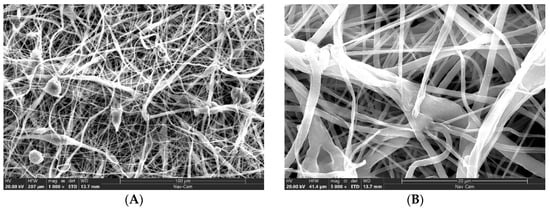 Scanning electron microscopy (SEM) images of polycaprolactone (PCL) nanofiber cloth infused with nanoemulsions of neem and lavender oil are depicted in Figure 1. Initially, the average diameter of PCL nanofibers is approximately 50 ± 12 nm. However, following the absorption of the nanoemulsion, the average diameter increases to about 100 ± 32 nm. At a magnification of 50,000×, the fusion of the fiber and nanoemulsion is visible. Images A and B show the PCL nanofibers alone, while images C and D display PCL nanofibers after the absorption of the neem oil nanoemulsion. This study focuses on the SEM imagery of neem oil nanoemulsions encapsulated within PCL. Neem oil is characterized by its high viscosity, resulting in a viscous and sticky appearance in the images. The SEM images also highlight the uniformity and size of the nanoemulsion droplets, reflecting the effectiveness of the encapsulation process. The nanofiber size of PCL changes after immersion in the neem oil nanoemulsion. In contrast, images E and F illustrate PCL nanofibers with lavender oil nanoemulsion, which are less viscous than neem oil. Finally, images E and F also present the PCL nanofibers with a combined nanoemulsion of lavender and neem oil in this study.
